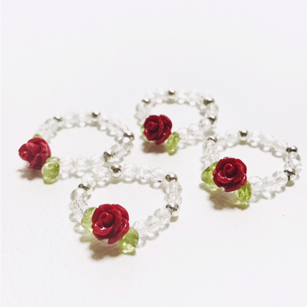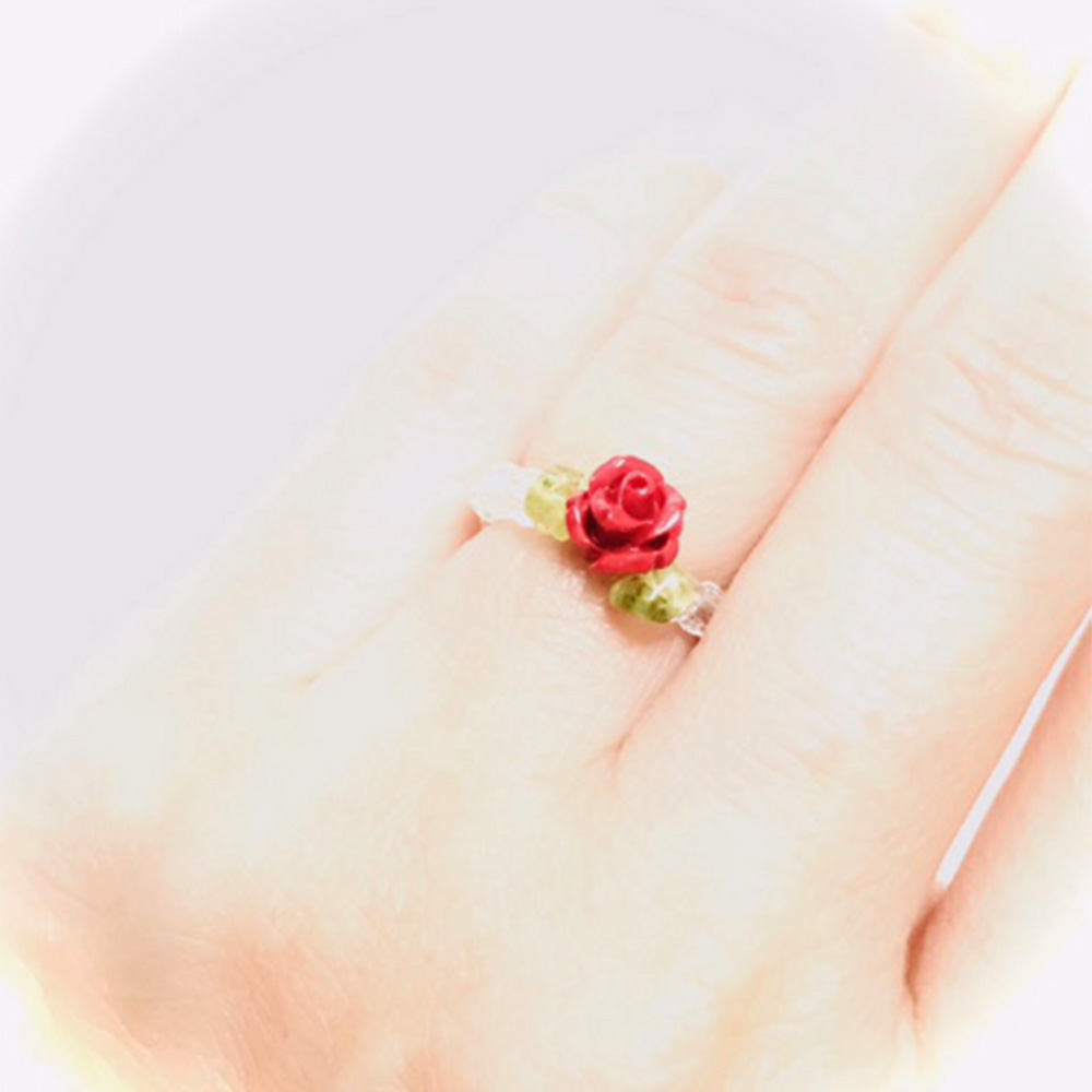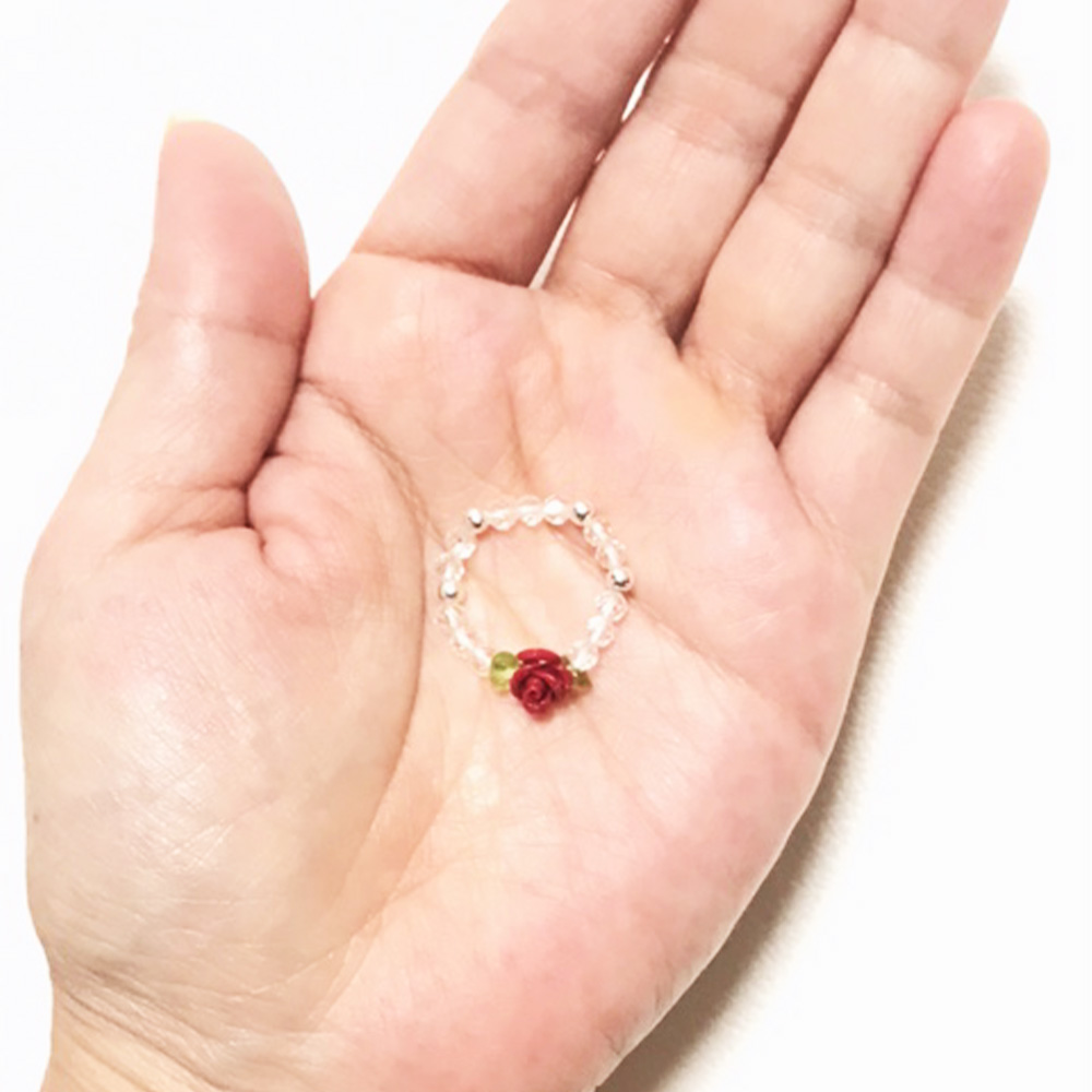 珊瑚で出来た深紅の薔薇が小さいのに存在感があり、ダイヤカットが施された極小水晶がさらに煌びやかさを