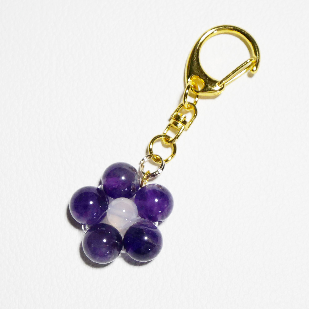 商品説明:天然石2種類を使って作られたお花をモチーフにしたキーホルダーです。