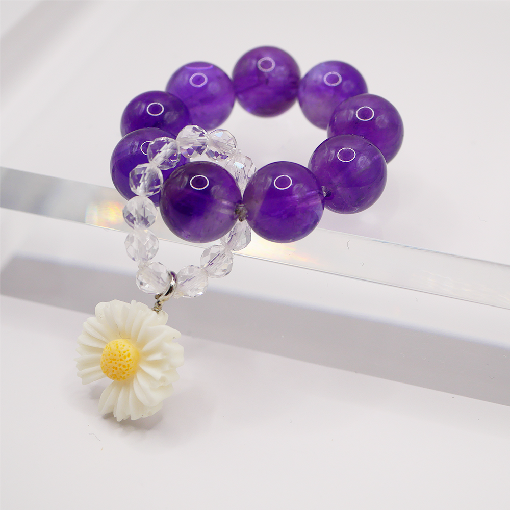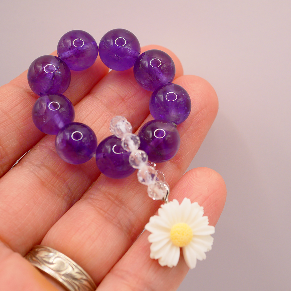 商品説明:天然石2種類とデイジーチャームを使用して作られたリングキーホルダー(ミニ数珠)です。