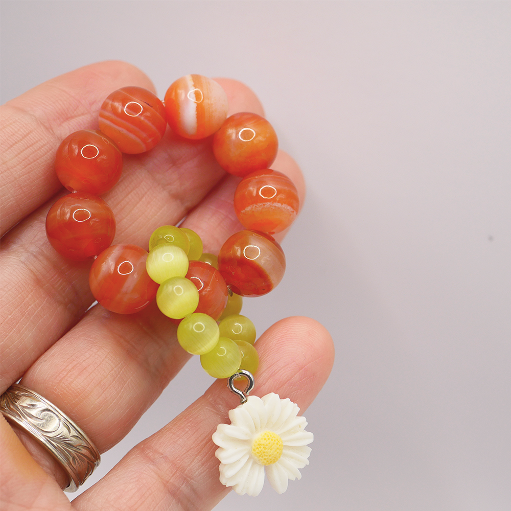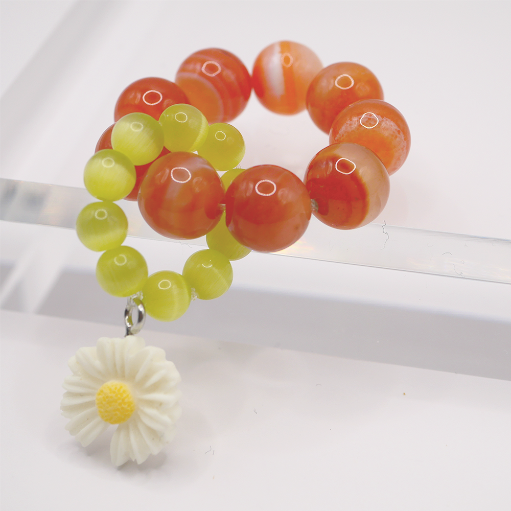商品説明:天然石2種類とデイジーチャームを使用して作られたリングキーホルダー(ミニ数珠)です。