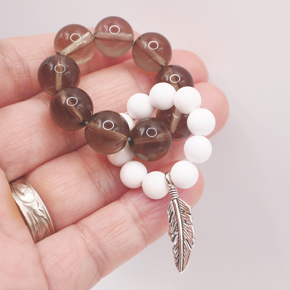 商品説明:天然石2種類とフェザーチャーム(羽根)を使用して作られたリングキーホルダー(ミニ数珠)です。